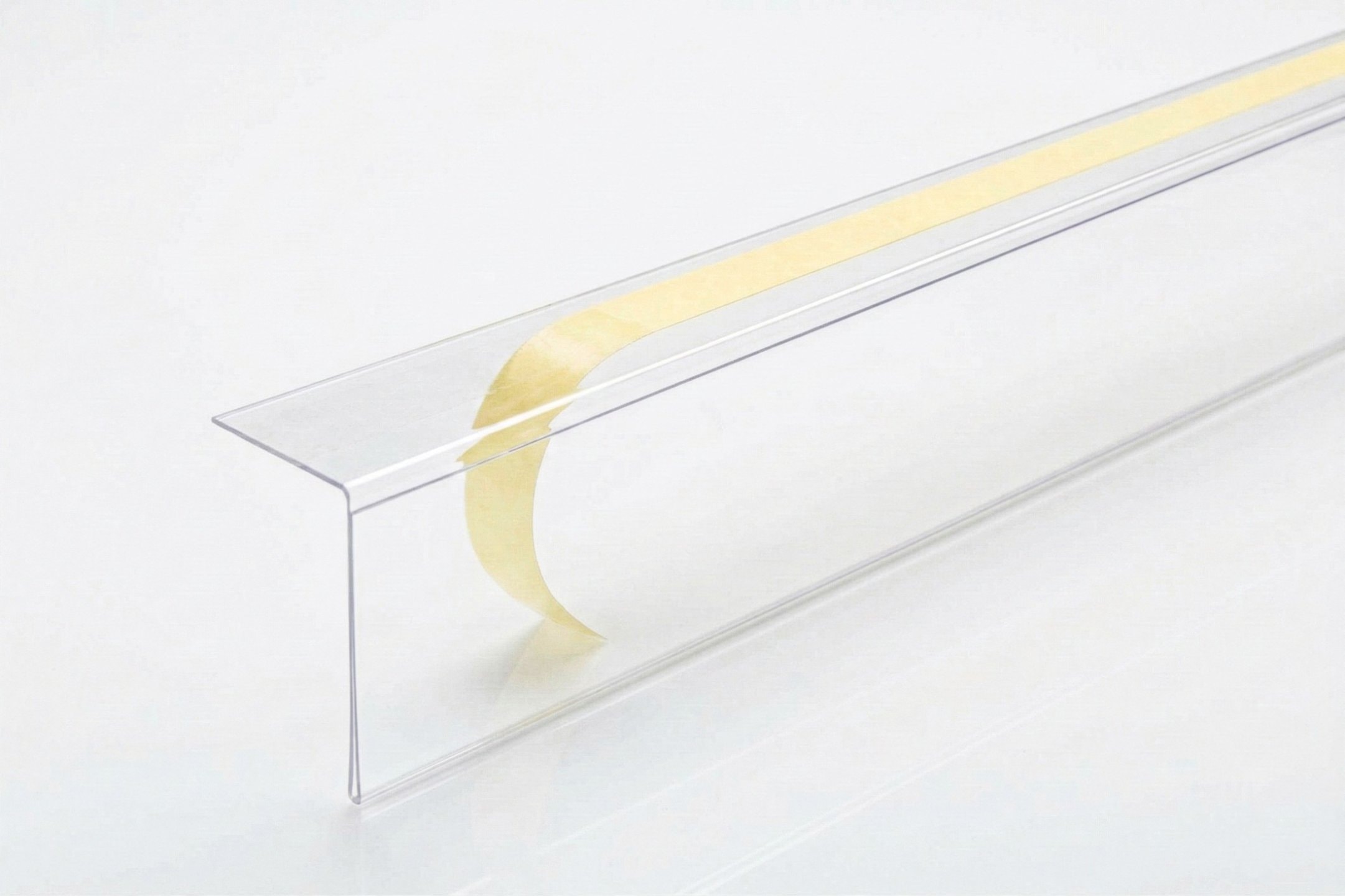 Plastová samolepiaca regálová lišta určená na vkladanie štítkov, cenoviek, čiarových kódov a popisiek. Vhodná na použitie na predajných a skladových regáloch, prezentačných stojanoch, vitrínach a v skladovom hospodárstve. Lišta je vyrábaná teplým ohýbaním plastového pásika. Tvar a vyhotovenie je možné meniť aj pri menších sériách. Na výrobu používame tvrdý číry PVC alebo PET materiál od nemeckého výrobcu Klöckner Pentaplast s lesklým alebo matným (antireflexným) povrchom. Matný povrch je odolnejší proti poškriabaniu, môže však sťažovať čítanie čiarových kódov.