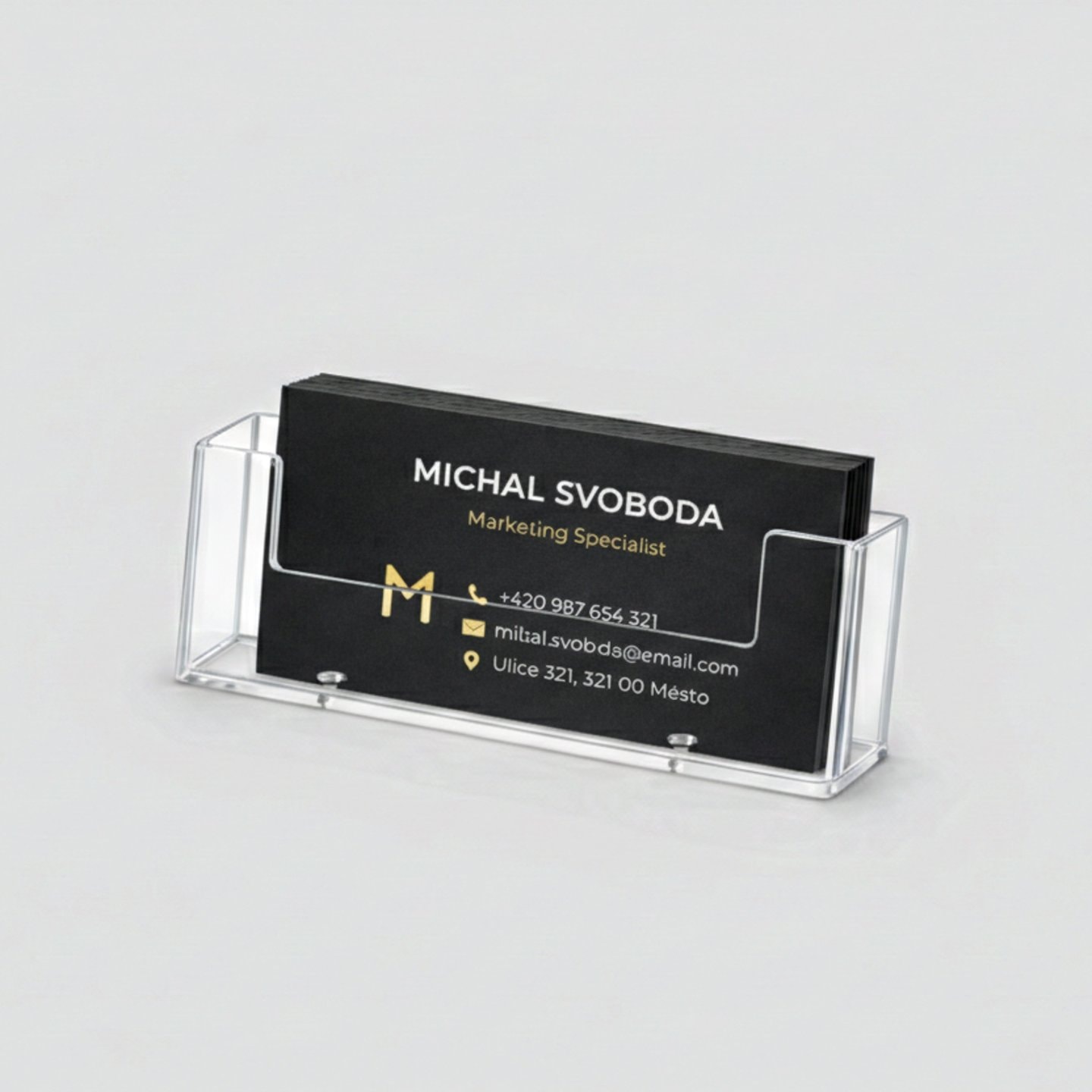 Zásobník pojme cca 50 kusů vizitek, dle tloušťky vizitek.